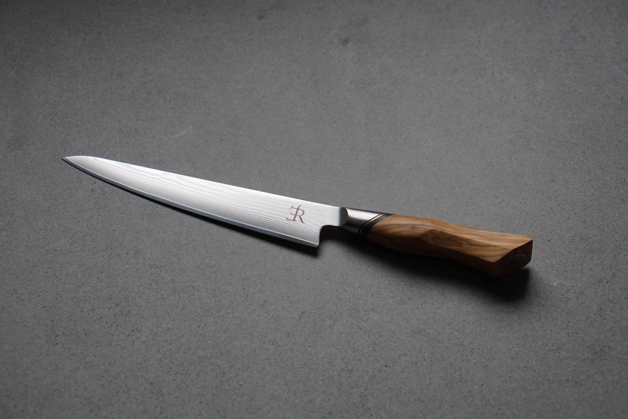 The blade features 73-layer high-carbon Damascus steel with a powder steel ST650 core. The handle is shaped from elegant French olive wood, providing a natural feel and timeless look.