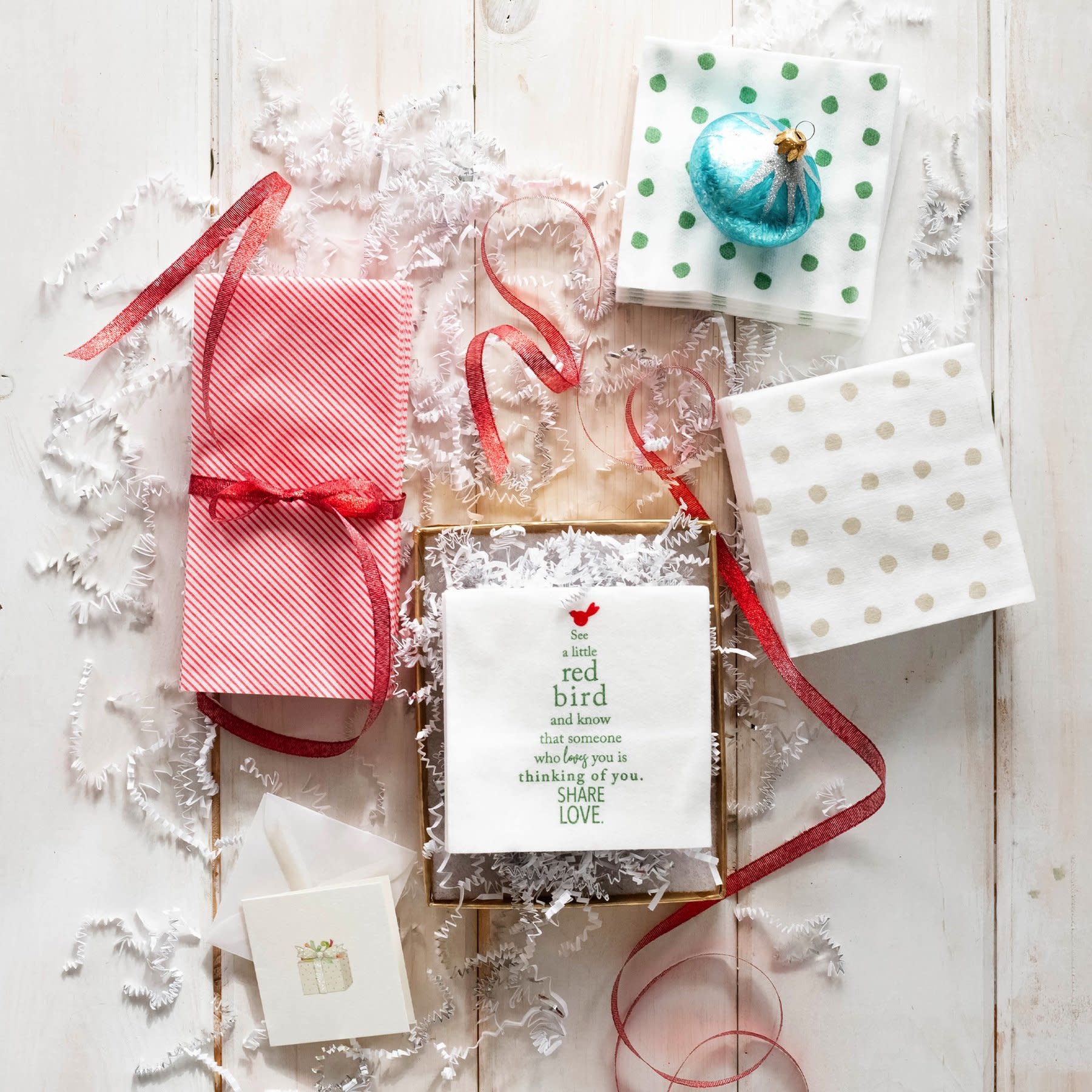 Papersoft Napkins Holiday Tree Cocktail Napkins are highly absorbent and made of a fibrous material (spunlace) in Italy. An easy grab-and-go gift for the hostess or a fun addition to your last-minute dinner party, these napkins are perfect for the holidays.