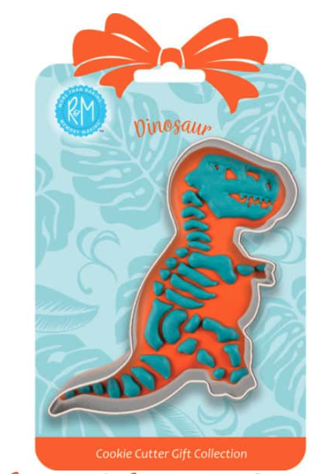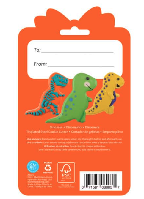 Dinosaur 4.75″ cookie cutter is made of high-quality tinplated steel. Packaged on a colorful card featuring cookie designs on the front and back for decorating inspiration. Makes a great gift for special occasions with space on the back for personalized gift greetings. Hand wash and dry thoroughly before and after each use.