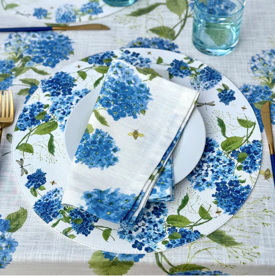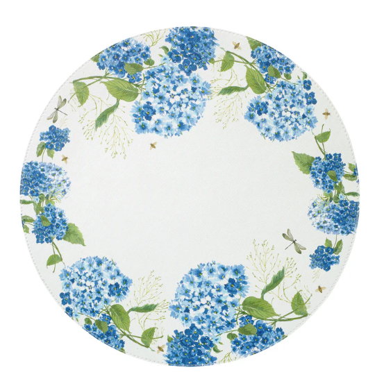Create a fresh and inviting table with our Hydrangea 15" Round Placemats. Featuring soft blue hydrangea blooms accented with charming details like bees and dragonflies, these placemats bring the beauty of the garden to your spring and summer table décor.