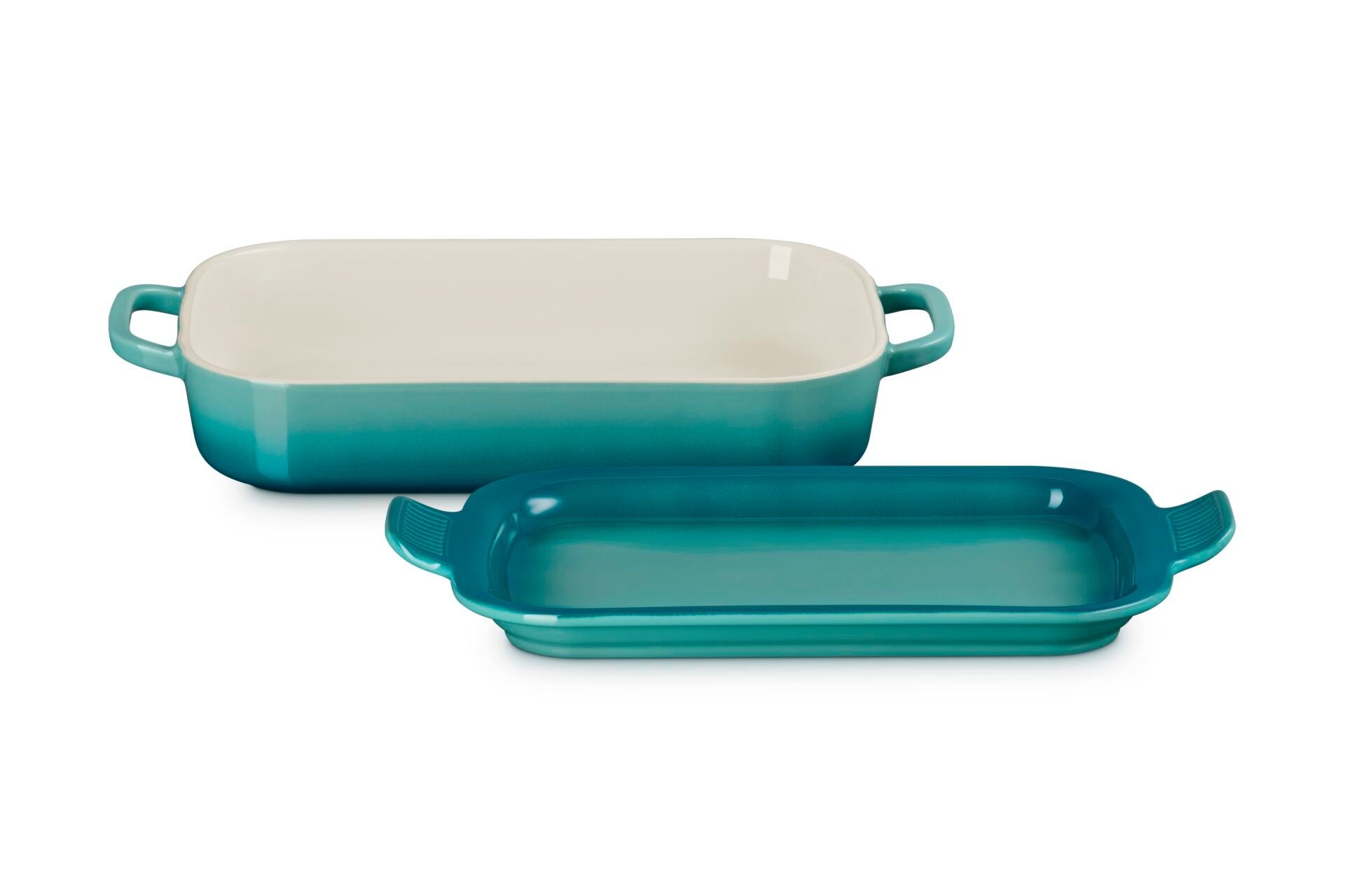 The Rectangular Dish with Platter Lid is designed for beauty and versatility from oven to table, and the two dishes can be used together or separately. Marinate meat or vegetables in the baking dish and then use the platter lid to serve after grilling or baking. Or use the baking dish on its own for everything from rich desserts to roasting vegetables, bubbling casseroles and more – the lid makes it easy to store leftovers. The platter lid is also an attractive serving piece for cheese, appetizers and salads. Crafted from premium stoneware to ensure food is cooked to perfection, the dishes feature a colorful glaze that is virtually nonstick for easy cleanup.