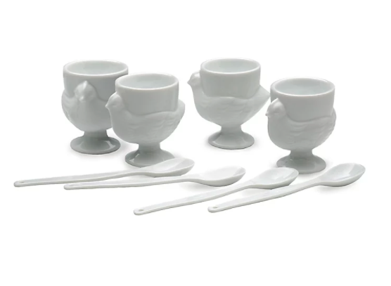 RSVP strives to offer quality kitchen products and cooking tools atpetitive prices. Our Porcelain Egg Cups and Spoons Set is a perfect example. Serve soft boiled eggs in our hen motif egg cups with matching egg spoons. The set is made of white porcelain and includes 4 cups and 4 spoons. The cup measures 2-3/4-inches in diameter by 2-inches tall with a 5-1/2-inch long spoon. All pieces are dishwasher safe.