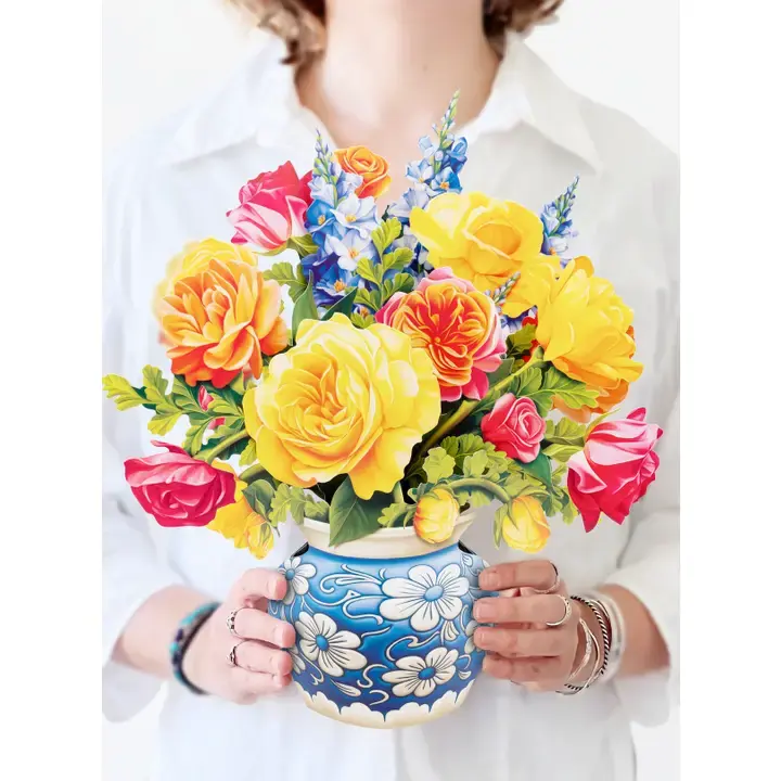 An exquisite arrangement of refreshing roses is a rare beauty to behold and the ultimate way to say “I’m thinking of you.” Elegantly gathered together with blue snapdragon accents, raspberry red, tangerine orange, strawberry pink, and limoncello yellow radiate out from standard and garden roses in a fitting blue and white floral vase. Symbolic of passion, courage, and love, FreshCut Paper’s Sorbet Roses are a fresh and sweet delight that brighten up every space they bloom in.