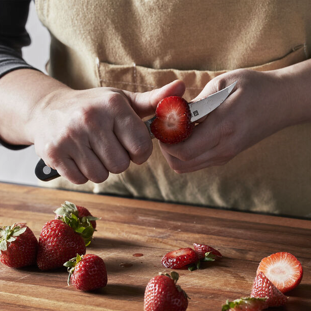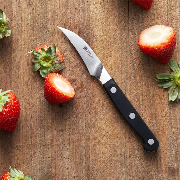 ZWILLING Pro boasts a unique curved bolster that acts as an extension of the hand, supporting the professional pinch grip, with thumb and index finger on the blade, for safe cutting and less fatigue. The blade was designed with a broad curve in the front to facilitate the rocking motion of Western cutting, while the straight back is ideal for the chopping motion Japanese knives were designed for. The full length of the blade can be used when cutting and can be sharpened from bolster to tip.