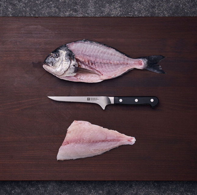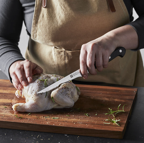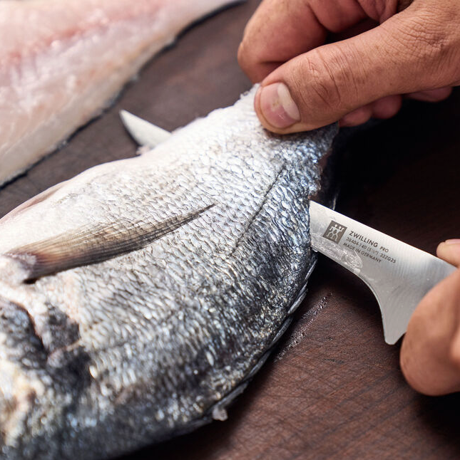 WILLING Pro boasts a unique curved bolster that acts as an extension of the hand, supporting the professional pinch grip, with thumb and index finger on the blade, for safe cutting and less fatigue. The blade was designed with a broad curve in the front to facilitate the rocking motion of Western cutting, while the straight back is ideal for the chopping motion Japanese knives were designed for. The full length of the blade can be used when cutting and can be sharpened from bolster to tip.
